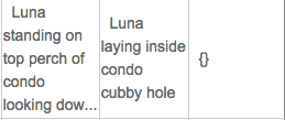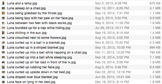 Hmm… it could work. Would take a ton of effort though. It seems to actually work where you just type 5-10 words about what a picture is about… noting prominent features. I’m not sure if I could outsource the scientific coding that you proposed…for reasonable money anyway. I think your solution could be the ideal though. The main problem I noticed, with the outsourcing, is that they don’t have a feel for what certain things are. They might call something maroon when it’s really brown in person, or they might refer to something as a “little house” when it’s a room in a cat tree. So I wouldn’t find them. But most of these pictures weren’t too important, and I can fix the ones I care about down the road anyway 🙂