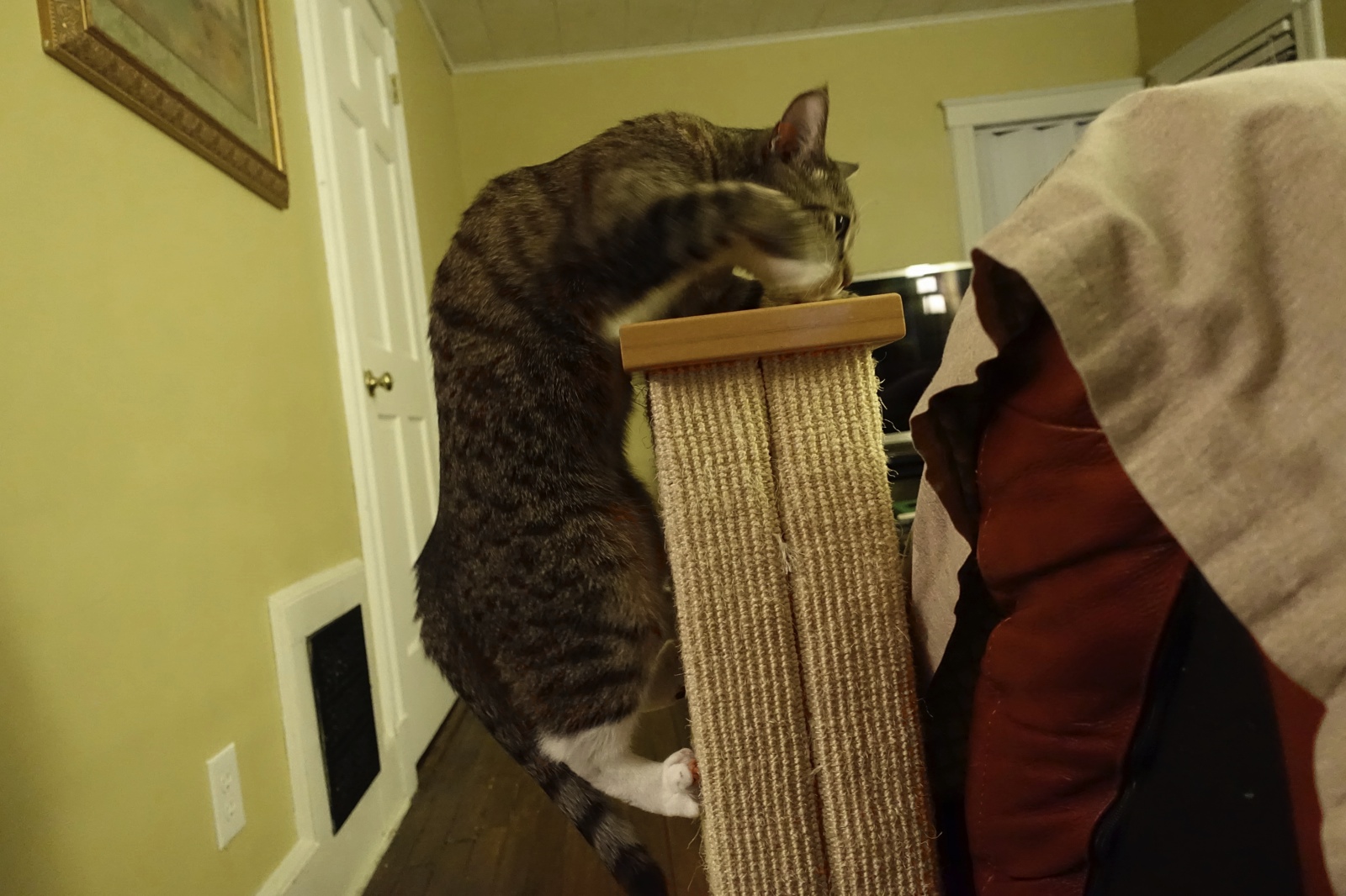 But wait. I think I see the treat! It’s on the scratching post!