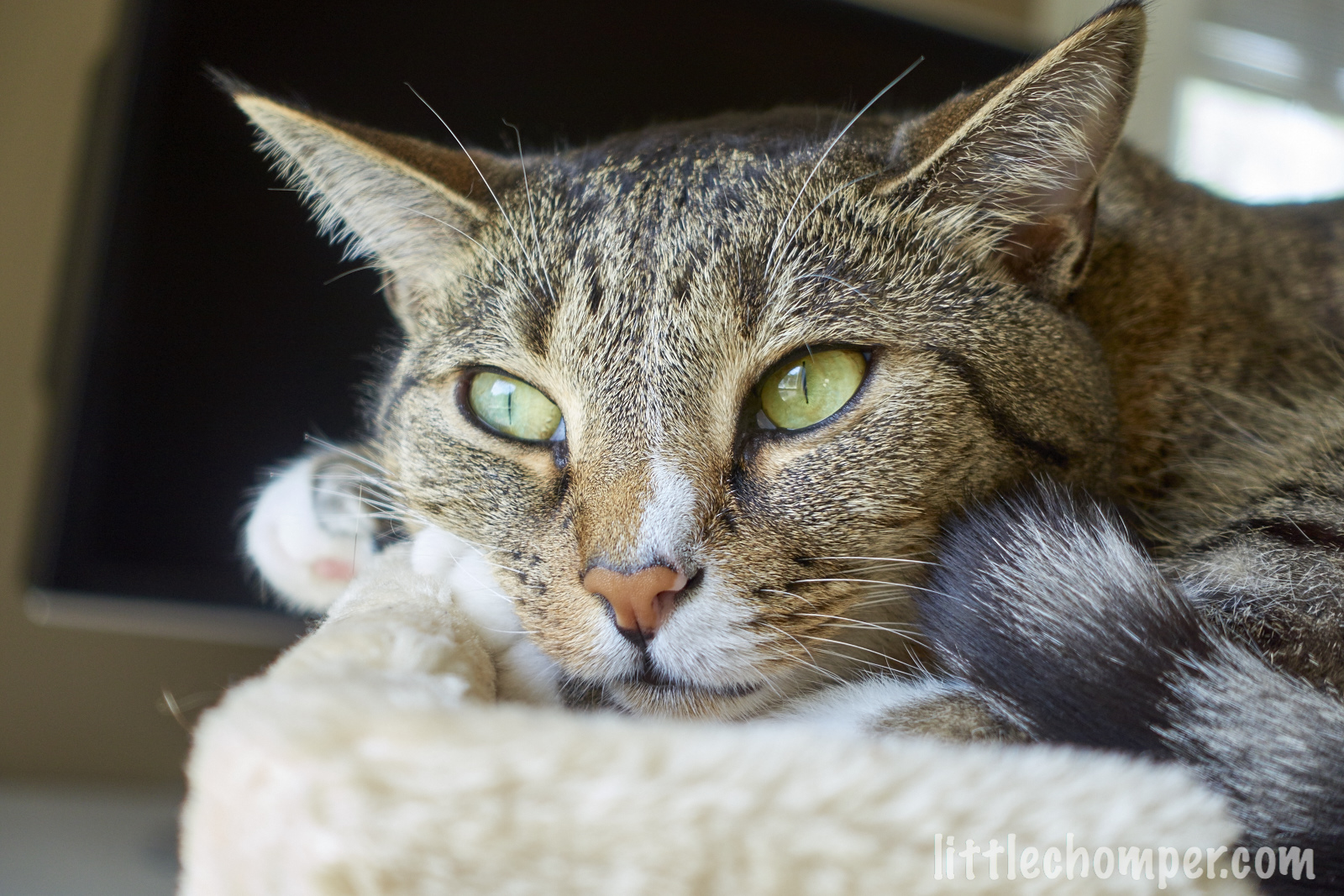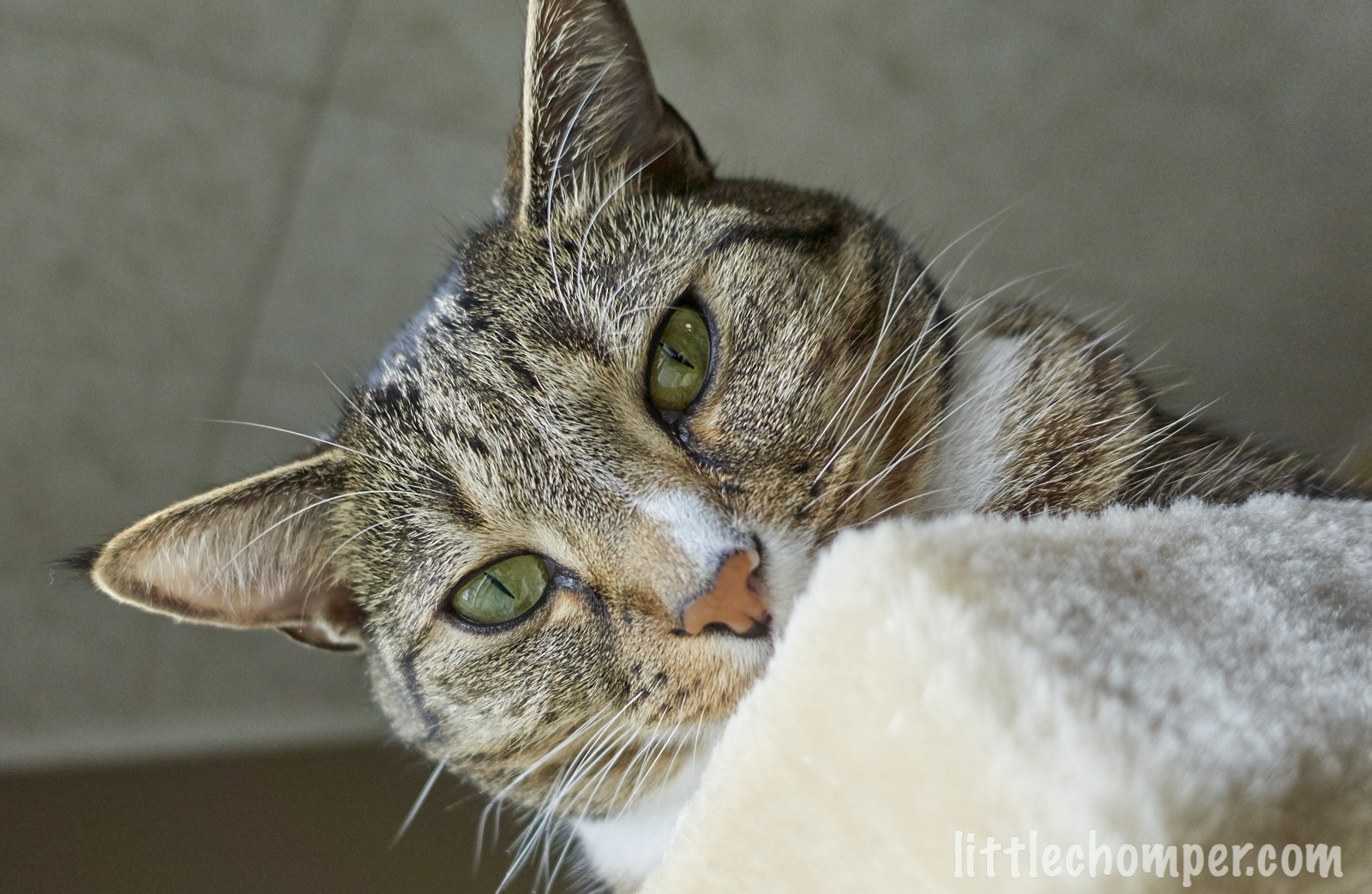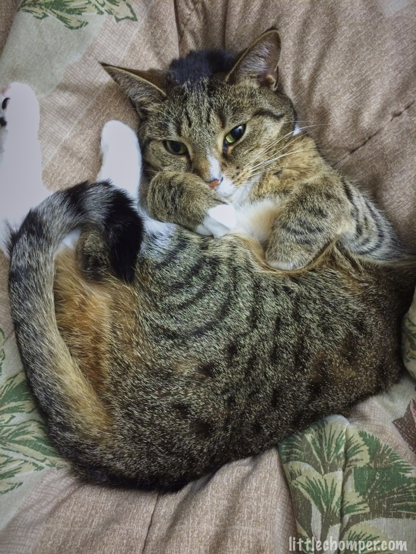 Luna on back on blanket with paws tucked in and feet up to side and one paw stretched up