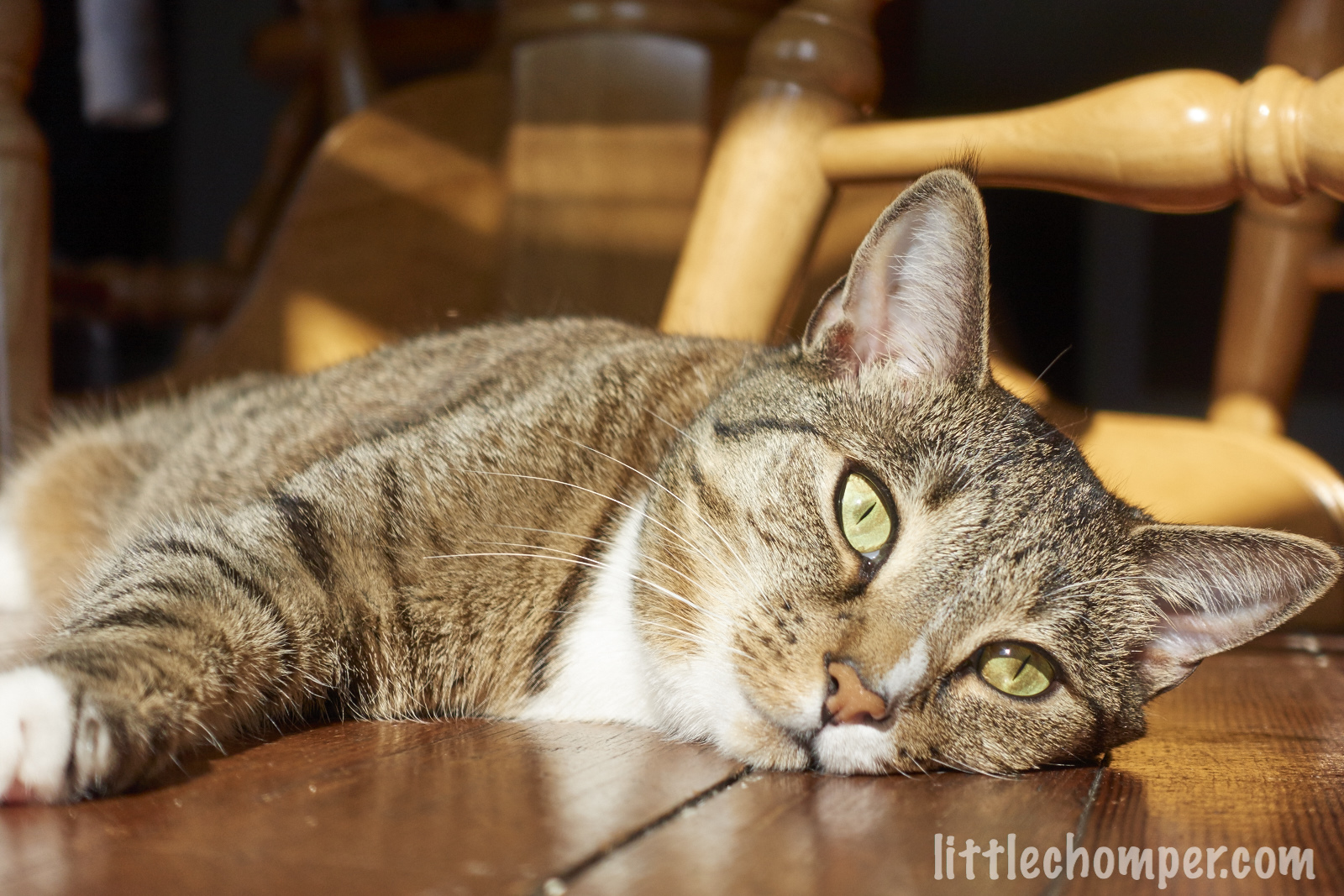 Luna lying along window looking down stonily